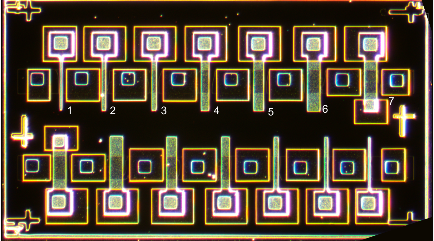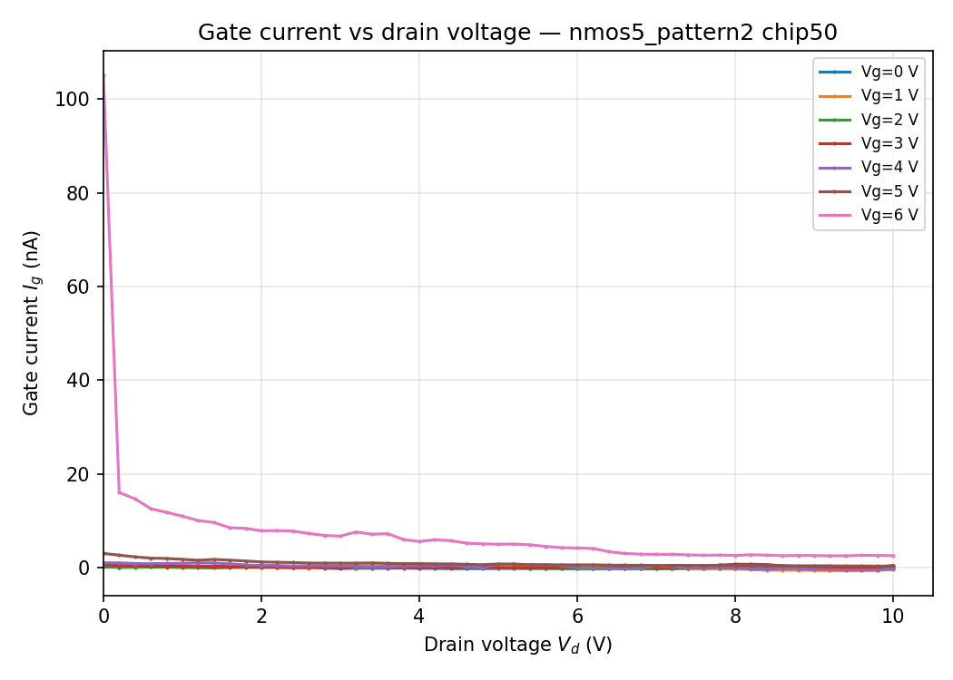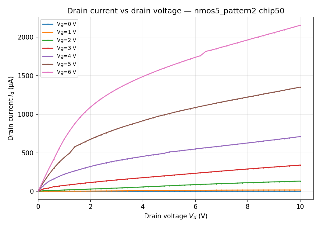 Electrical characterization was performed using a Keithley source-measure unit (SMU). For each transistor, the gate voltage (Vgs) was stepped from 0 V to 6 V in 1 V increments, while the drain voltage (Vds) was swept from 0 V to 10 V at each gate bias. The source was held at ground throughout. This generated a family of Id-Vd curves (output characteristics) for each device. One hundred transistors were probed in total: 50 on Chip 19 and 50 on Chip 50. The devices span seven NMOS transistor sizes (gate lengths of 5 µm through 30 µm) across eight spatial pattern positions on each chip.