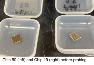 An important distinction between the two chips comes from a process difference during insulator deposition. For Chip 19, the intended 700B spin-on silicon oxide layer was deposited and baked . For Chip 50, due to repeated cracking issues during baking the glass, this step was modified and a baked AZ photoresist was used instead of 700B. Since fabrication parameters were not fully standardized, these variations are treated as experimental process variables to help guide future process optimization.