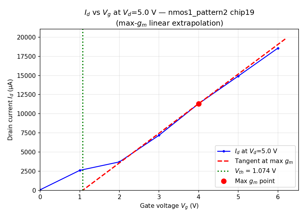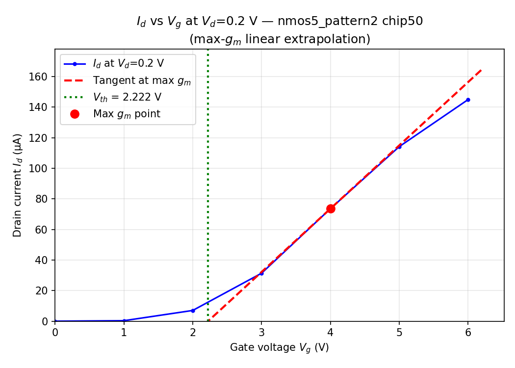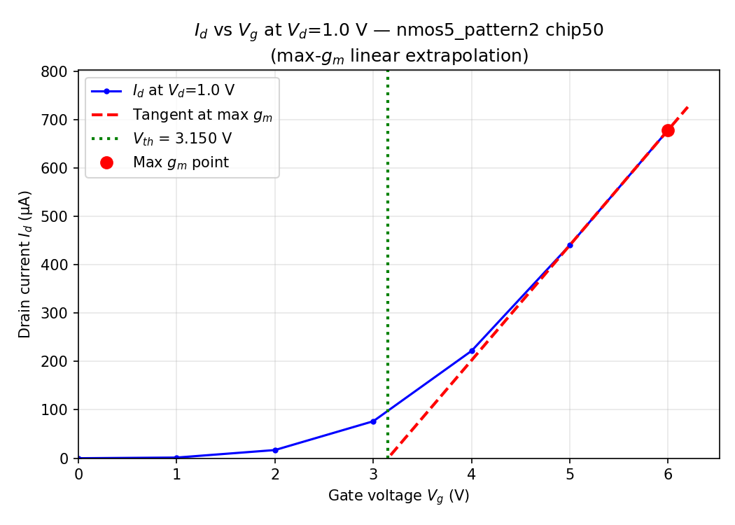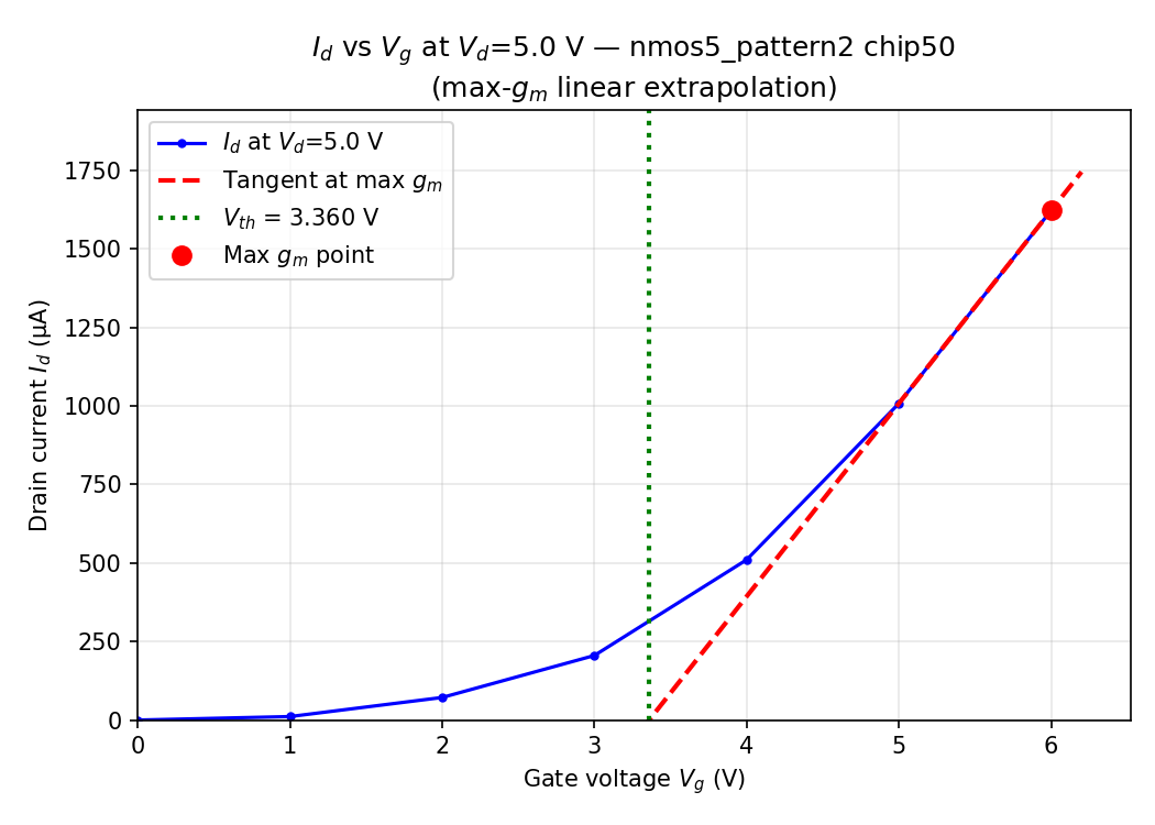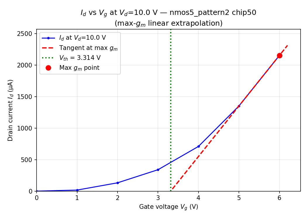 Vth was extracted using the linear extrapolation method applied to the transconductance curve at a reference drain voltage. At each gate voltage step, the drain current at the reference drain voltage (Vd_ref = 5 V) was found, the transconductance gm = dId/dVgs was computed, and the gate voltage at which the linear extrapolation of the Id-Vgs curve intersects zero current was taken as Vth. Vth was extracted at four drain biases (Vd = 0.2 V, 1 V, 5 V, 10 V) to assess drain-induced threshold variation. The Vd = 5 V value is used as the primary Vth reference in all statistical analyses.