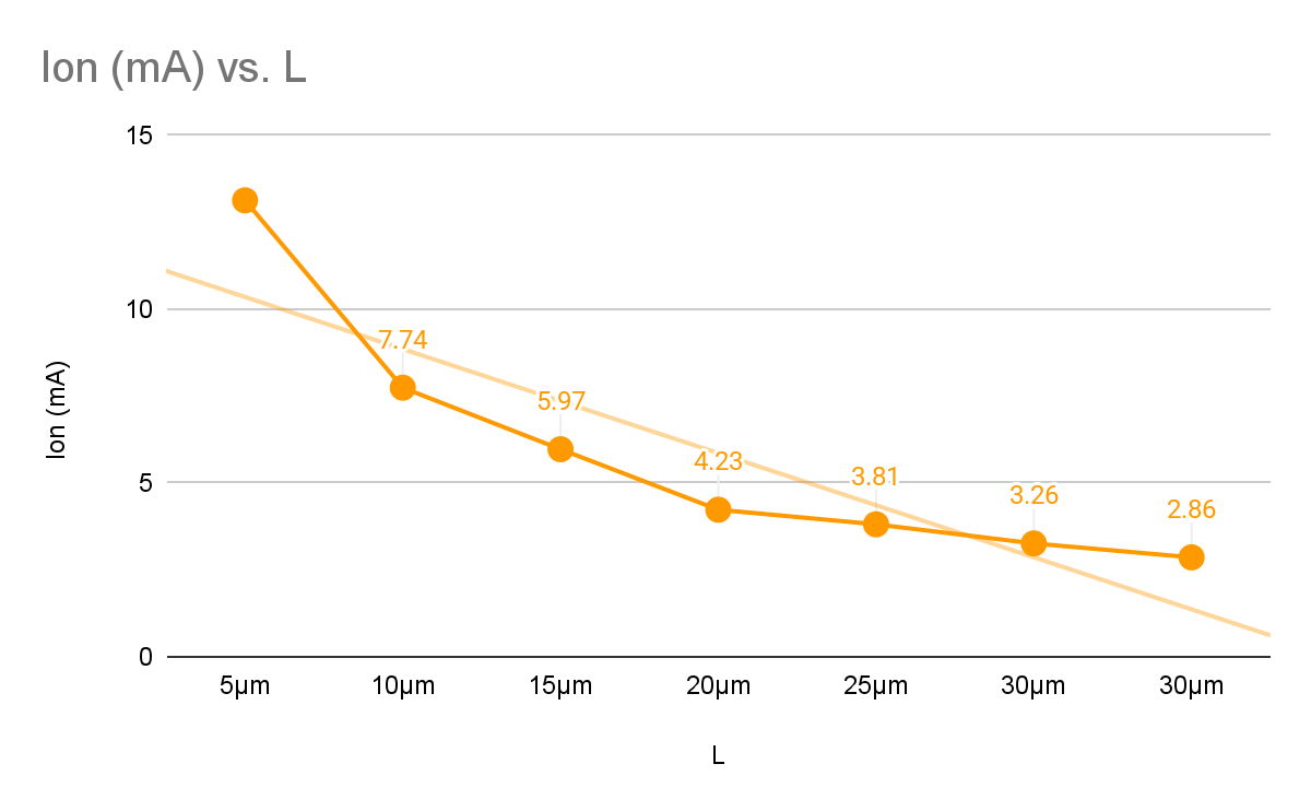 The size-dependent trend of decreasing Ion with increasing gate length is expected for standard MOSFET theory.