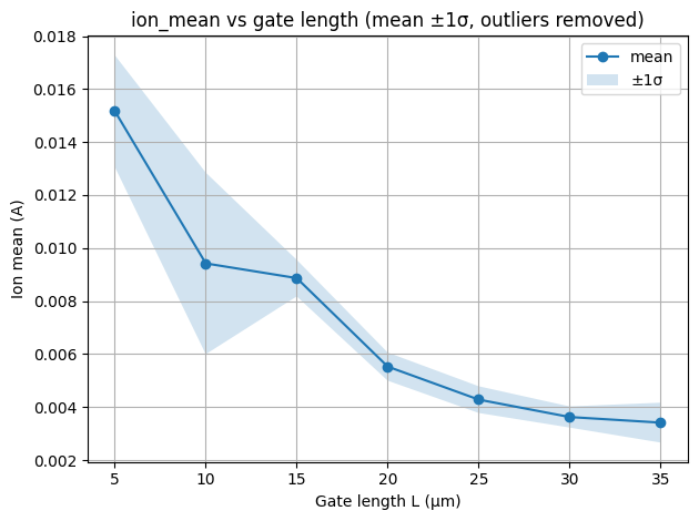 On/Off Current Ratio Ion/Ioff is computed directly from the extracted Ion and Ioff values: Ion/Ioff = Ion / Ioff.
