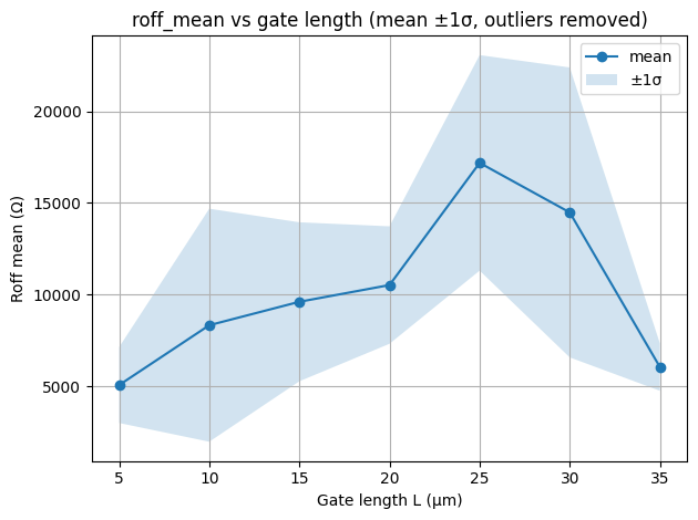 Off Current (Ioff) and Off Resistance (Roff) Ioff is defined as the average drain current at Vgs = 0 V over Vds ∈ [4, 6] V: Ioff = mean{Id | Vgs = 0 V, Vds ∈ [4, 6] V}. Roff is computed pointwise as Vds/Id over the same window and then averaged: Roff = mean{Vds/Id | Vgs = 0 V, Vds ∈ [4, 6] V}.