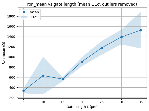 Ron increases monotonically with gate length, consistent with the decreasing Ion trend. Ioff shows no strong size trend on either chip, which is expected.