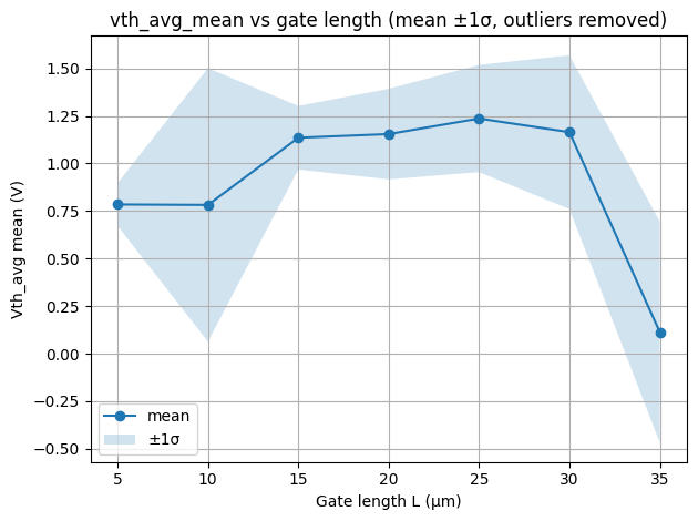 After automated extraction, each device's I-V graph was inspected visually. Devices exhibiting breakdown behavior, non-monotonic curves not consistent with NMOS operation, or clearly anomalous parameter values were flagged and excluded from statistical averages. Six devices out of 100 were excluded on this basis, leaving 94 valid devices in the final dataset.