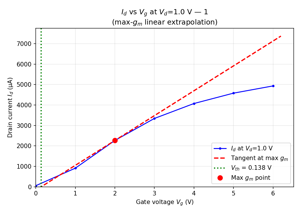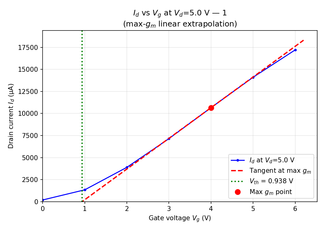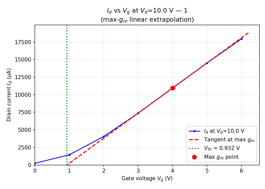 Vth was extracted using the linear extrapolation method applied to the transconductance curve at a reference drain voltage. At each gate voltage step, the drain current at the reference drain voltage (Vd_ref = 5 V) was found, the transconductance gm = dId/dVgs was computed, and the gate voltage at which the linear extrapolation of the Id-Vgs curve intersects zero current was taken as Vth. Vth was extracted at four drain biases (Vd = 0.2 V, 1 V, 5 V, 10 V) to assess drain-induced threshold variation. The Vd = 5 V value is used as the primary Vth reference in all statistical analyses.