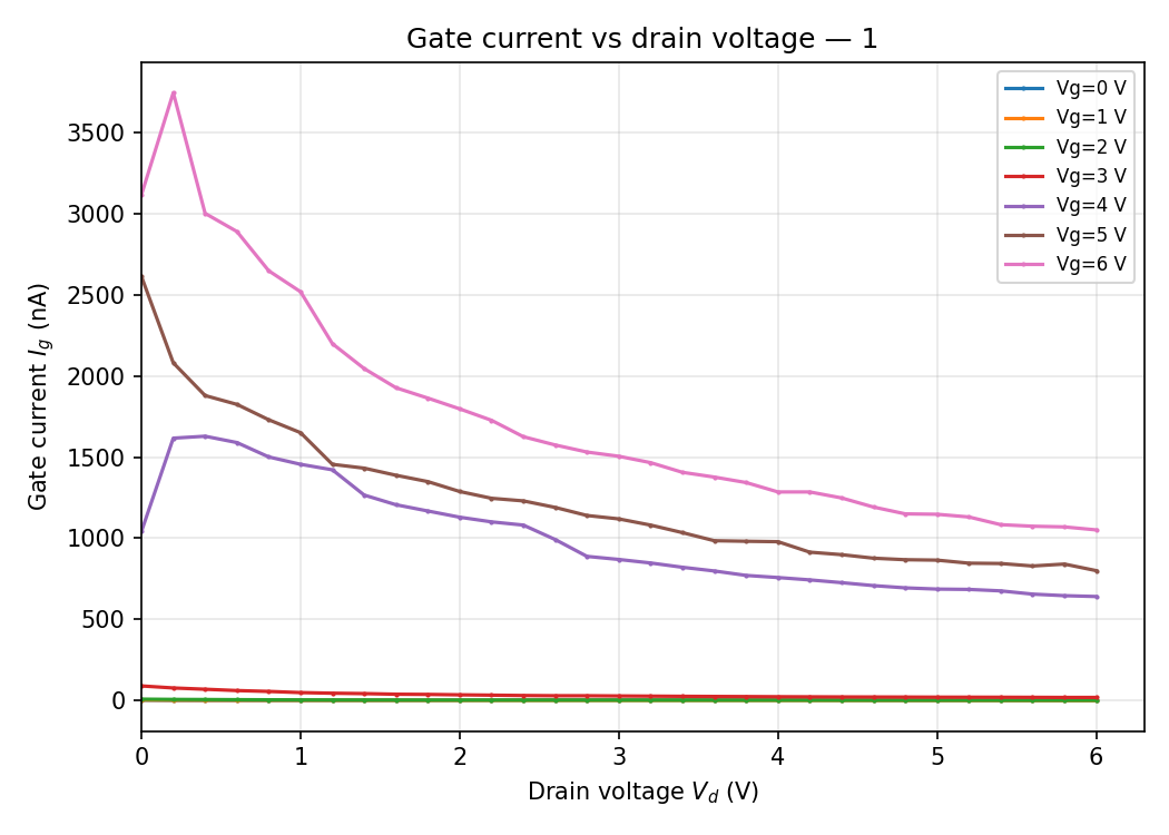 The Ig-Vd plot reveals critical information regarding the quality of the gate dielectric. Although the gate current Ig is in the nano-ampere (nA) range—much smaller than the drain current—it reaches levels as high as 3,500nA at Vgs = 6V, which is relatively high for a standard gate oxide. This suggests potential gate leakage due to thin spots or defects in the dielectric layer formed during fabrication. Interestingly, Ig decreases as Vd increases; this occurs because a higher drain voltage reduces the potential difference between the gate and the drain (Vgd), thereby lowering the electric field across the oxide near the drain. This leakage, combined with the observed Ioff at Vgs = 0V, highlights the impact of process-related factors on the overall switching contrast and device reliability.